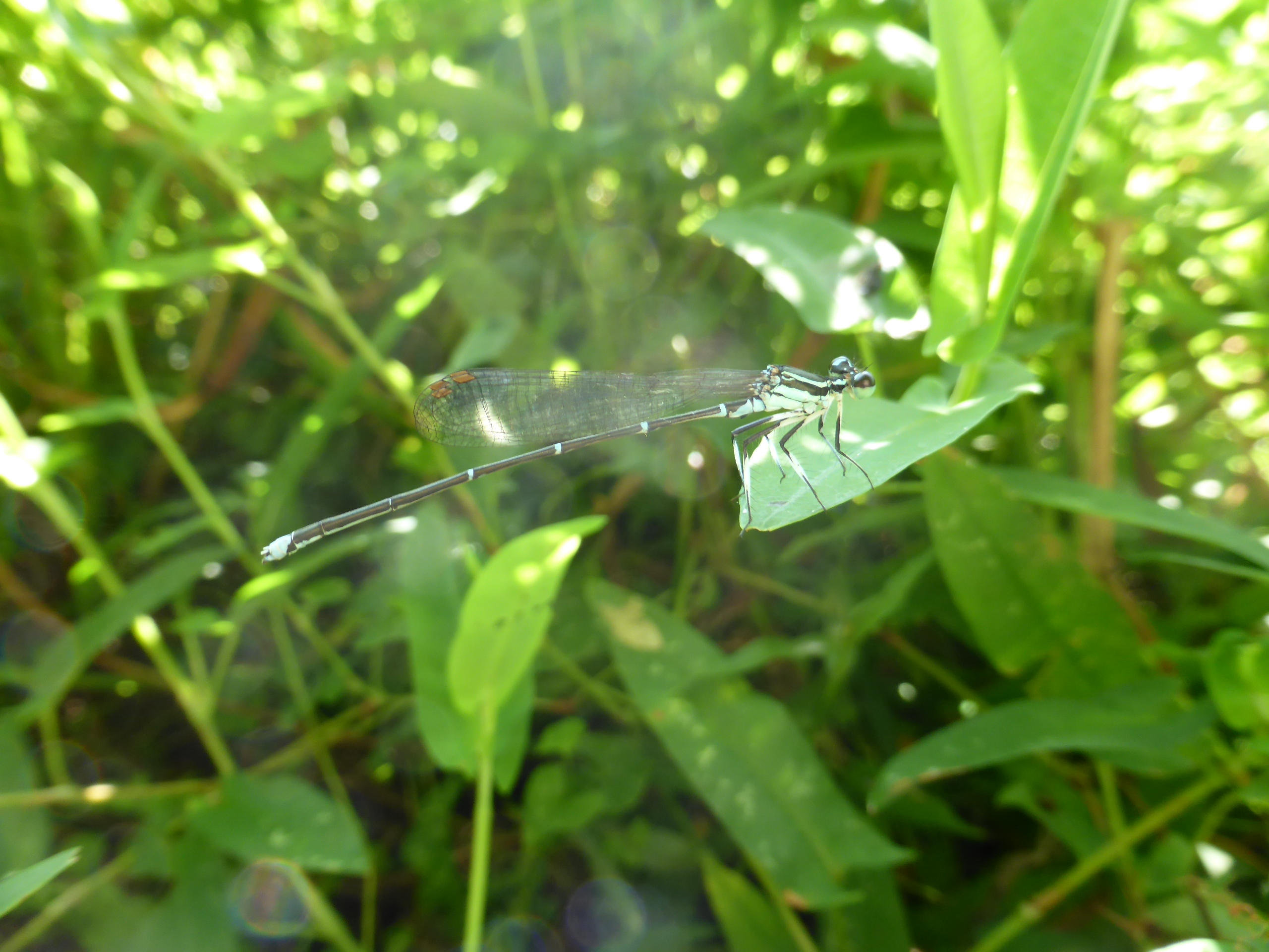 今日の1枚「モノサシトンボ」 2015年8月3日 腹部の節にある青い紋がものさしのように見えるため、その名で呼ばれるモノサシトンボ。 姫逃池でもたくさん見られます。 オスの脚には青白い模様があり、 池のまわりを飛んでいる姿からも、その白い足元を確認することができます。