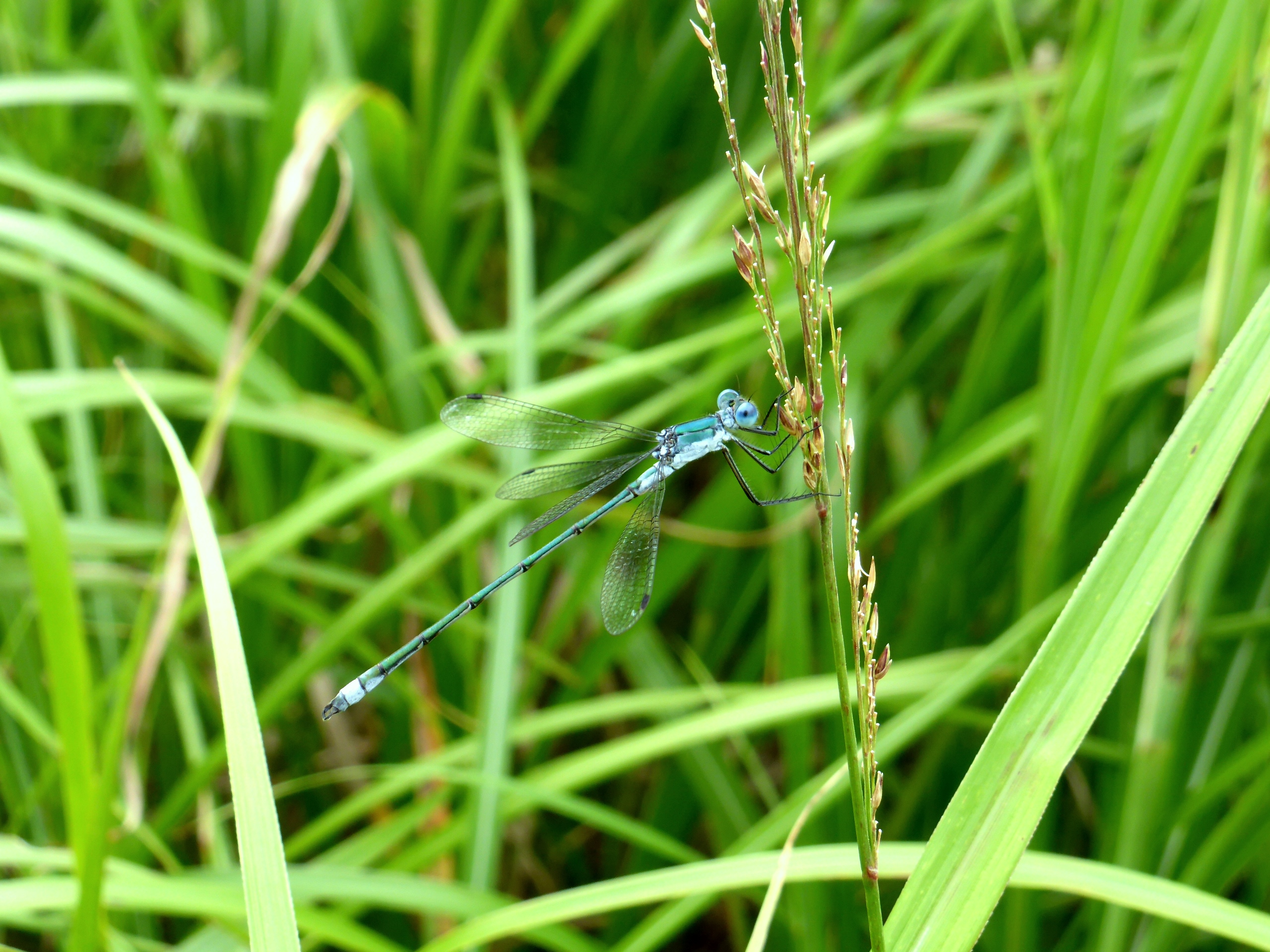 今日の1枚「アオイトトンボ」 2015年8月29日 三瓶北の原では、光沢の美しいアオイトトンボの姿を見ることができます。 多くのイトトンボの仲間が翅を閉じてとまるのに対し、翅を開いてとまる様子が特徴的です。 良く似たオオアオイトトンボも北の原で見られるそうなので、 撮影できた際にはご紹介したいと思います。